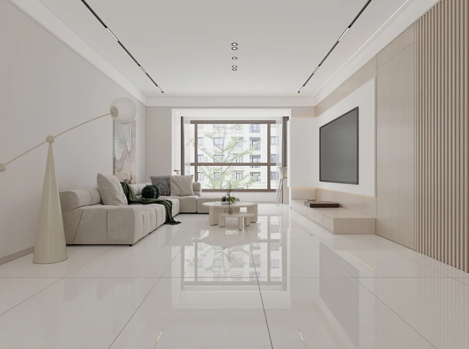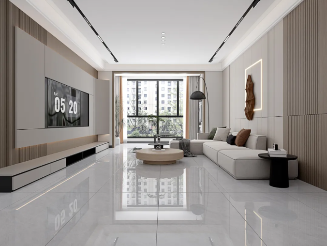 充满美感的尼克米白运用在客厅中,搭配灰色的布艺沙发和利落的线条感,既丰富了空间的视觉层次,又能让每个角落都能感受到宁
